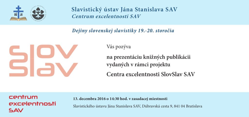 Dňa 13. decembra 2016 sa na pôde Slavistického ústavu Jána Stanislava SAV v Bratislave konala verejná prezentácia publikácií vydaných Centrom excelentnosti SAV SlovSlav. Vedúci centra excelentnosti i všetci ostatní autori a editori publikácií zhodnotili a komentovali vedecký i spoločensko-kultúrny prínos jednotlivých titulov a odpovedali na otázky prítomných účastníkov prezentácie, medzi ktorými bola aj veľvyslankyňa Bulharskej republiky na Slovensku.